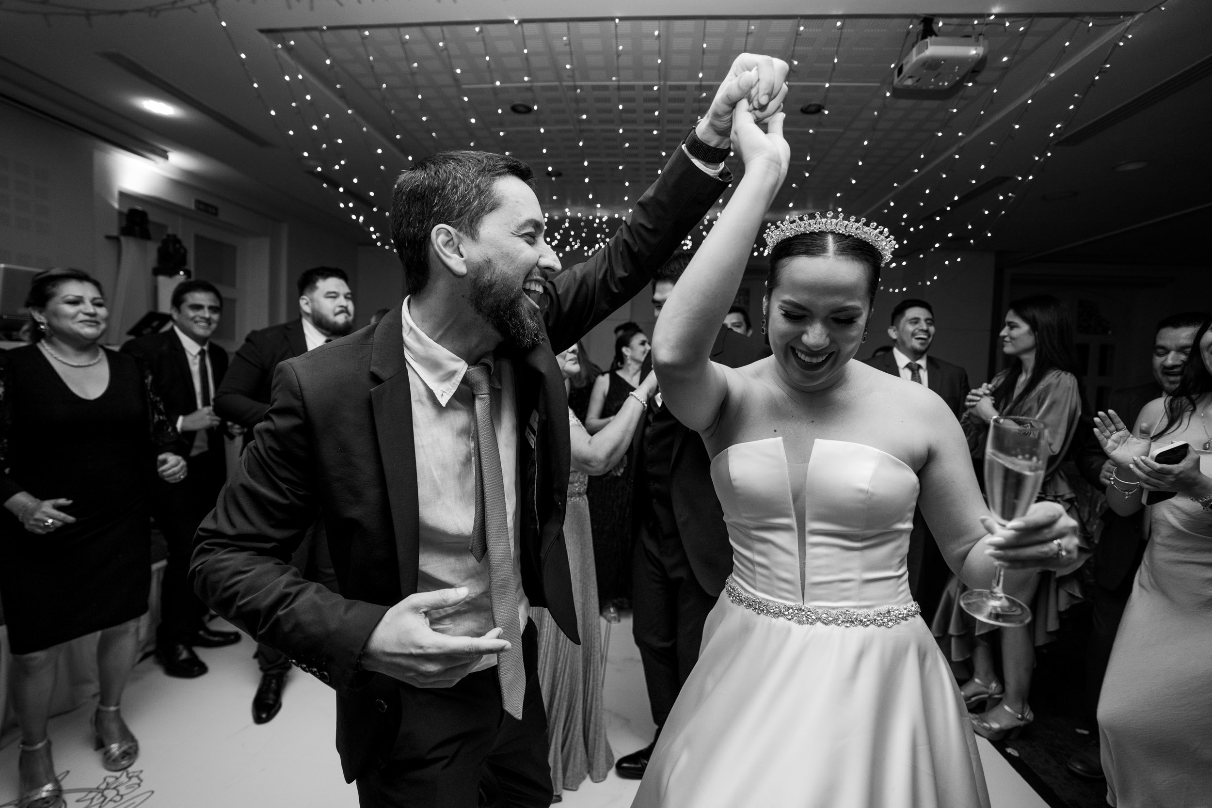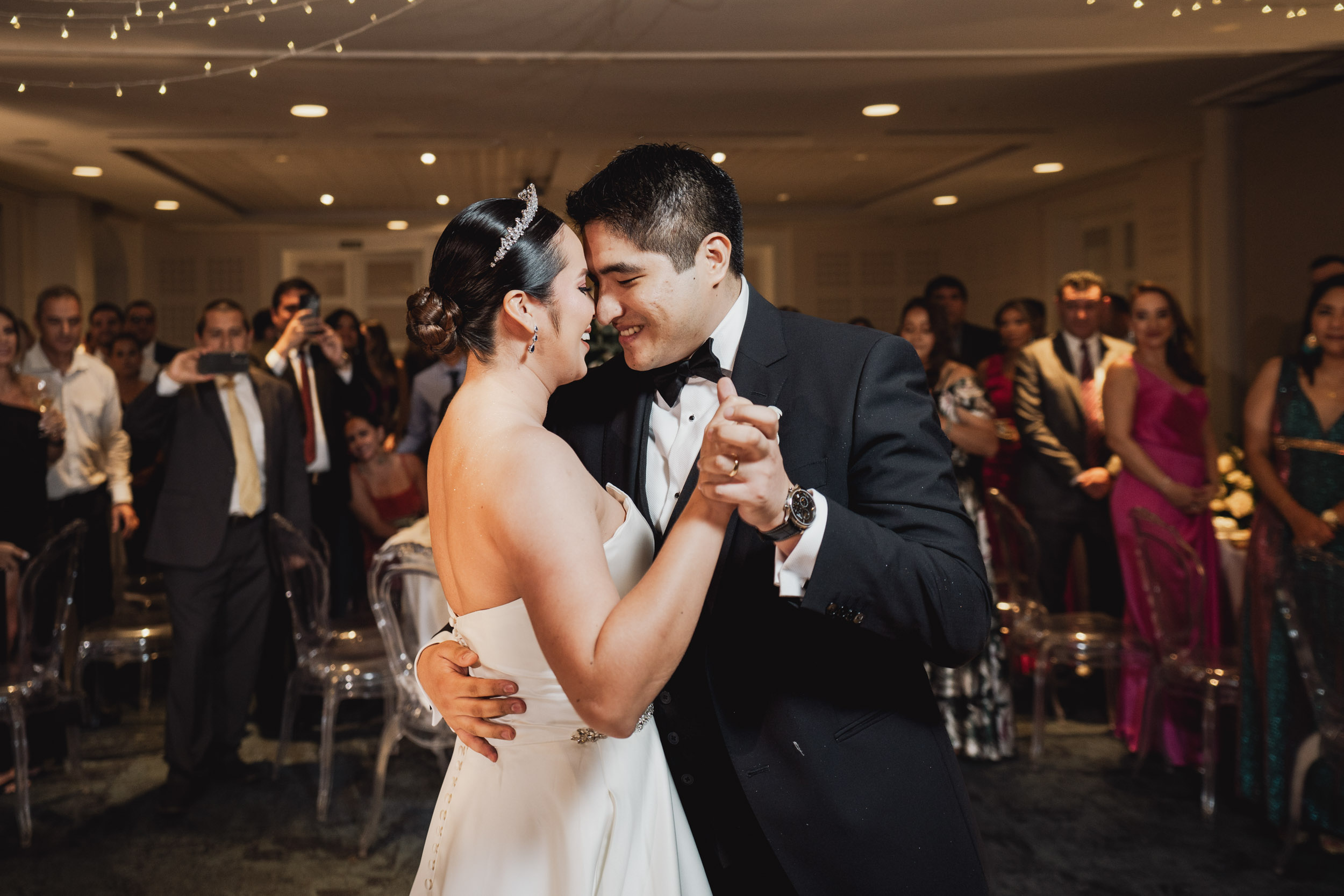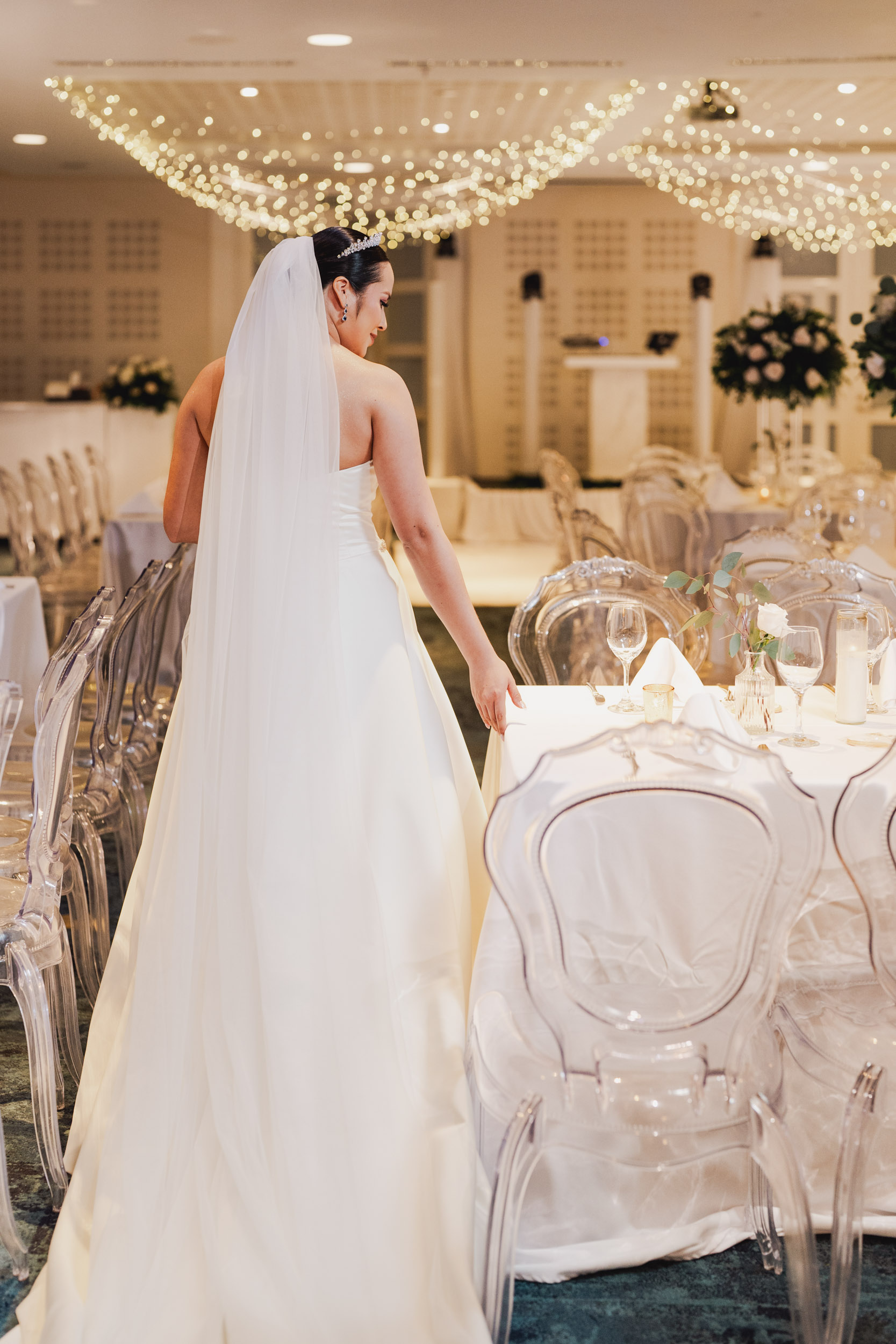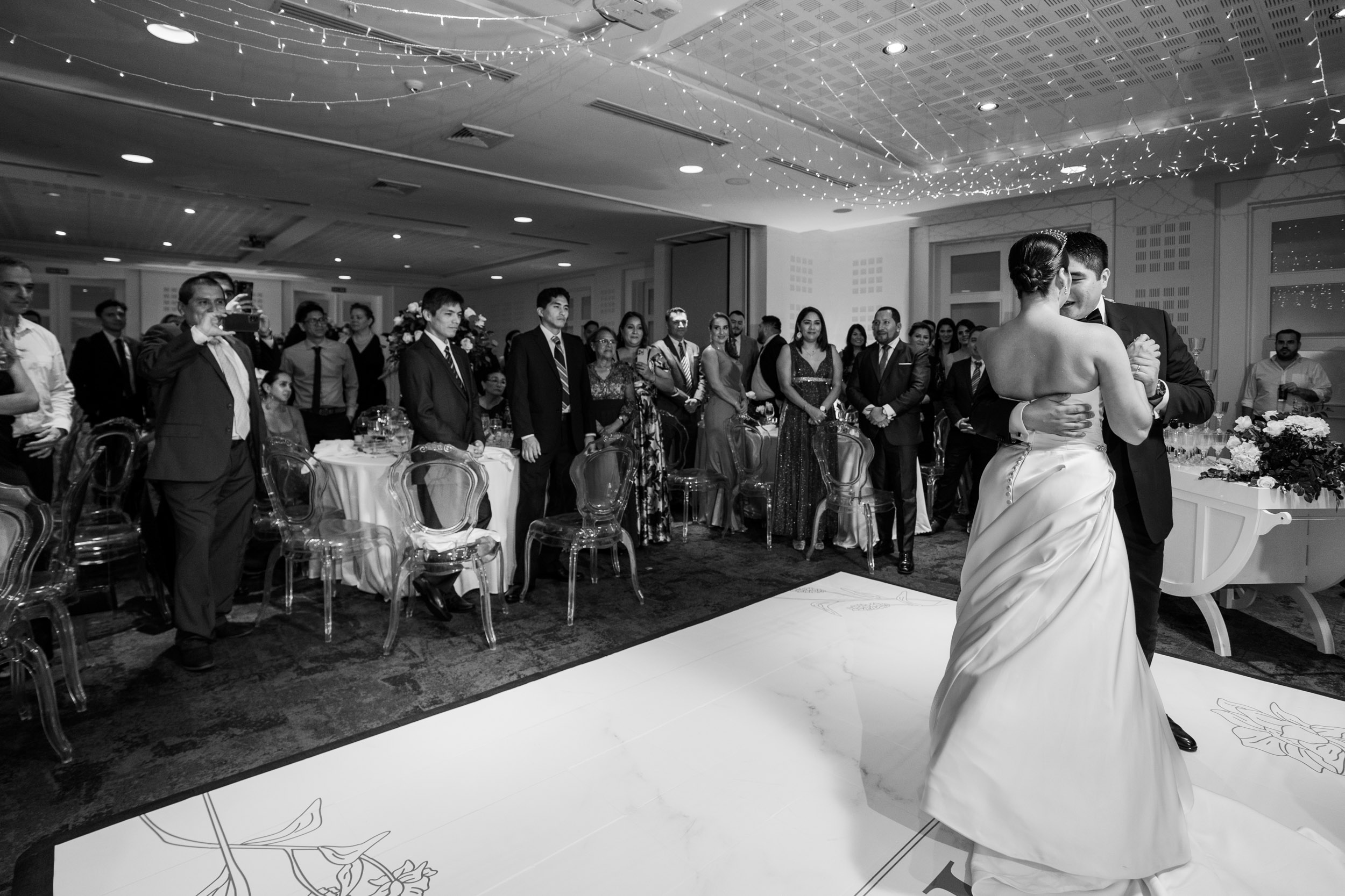 Los novios tenían un gusto impecable por la elegancia, y esto se reflejó en cada rincón. Todos los elementos se complementaban, desde las sillas transparentes a las copas que atrapaban la luz, las lucitas en el techo para crear una atmósfera cálida, y para culminar, un toque de sofisticación con mesas imperiales y redondas.