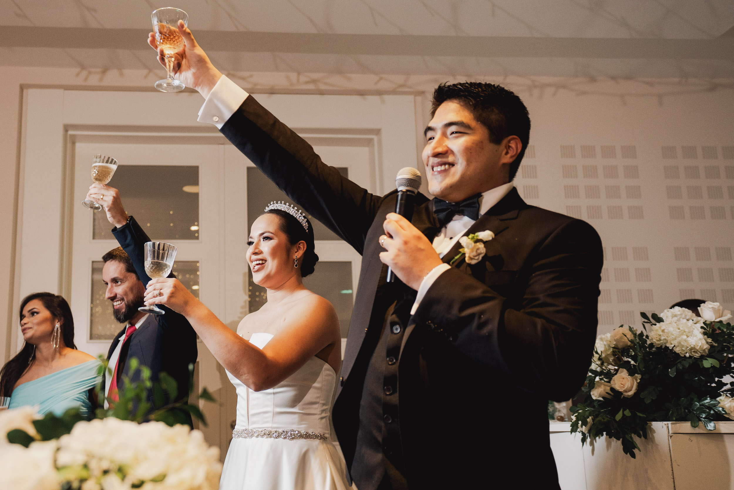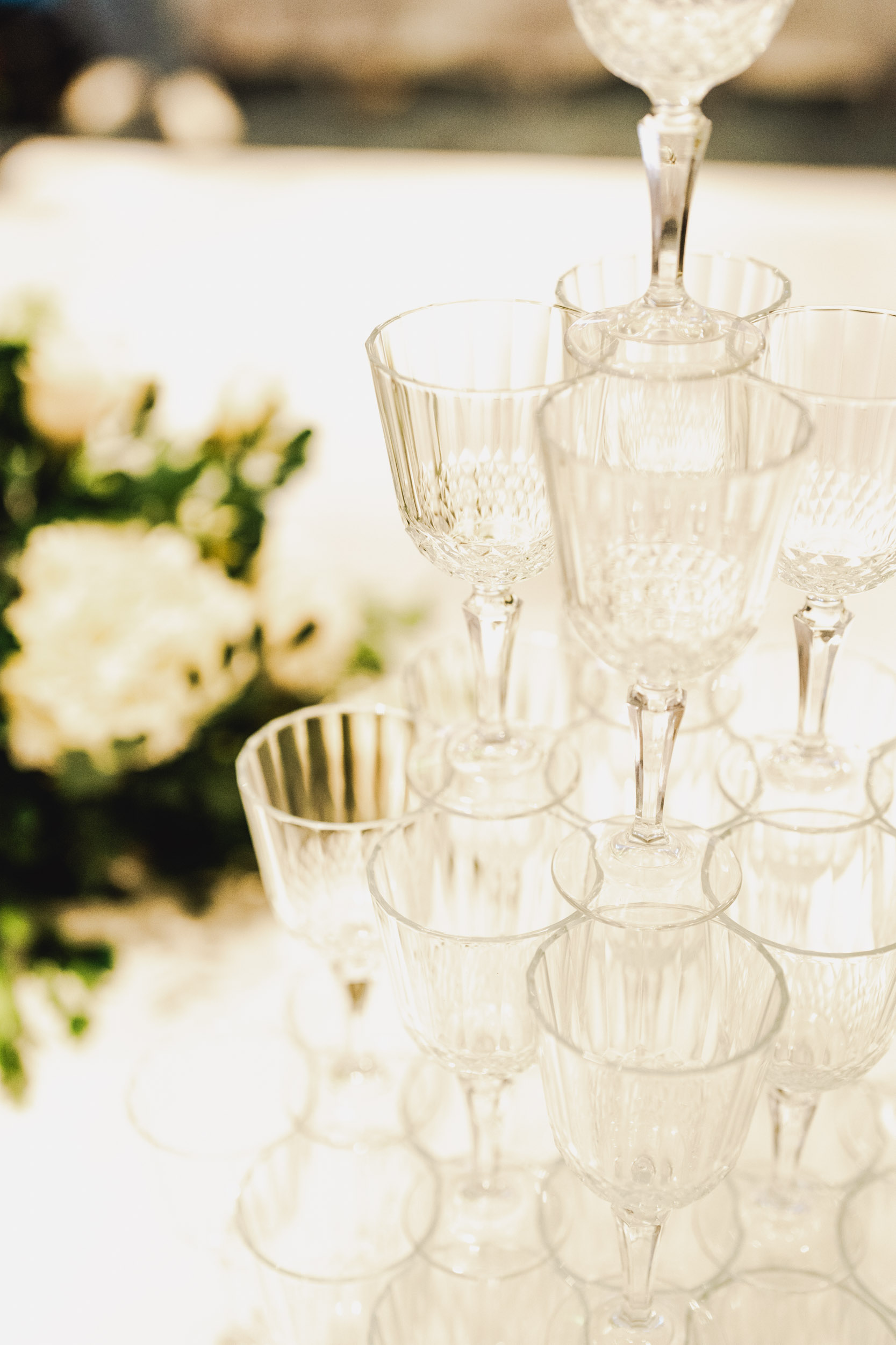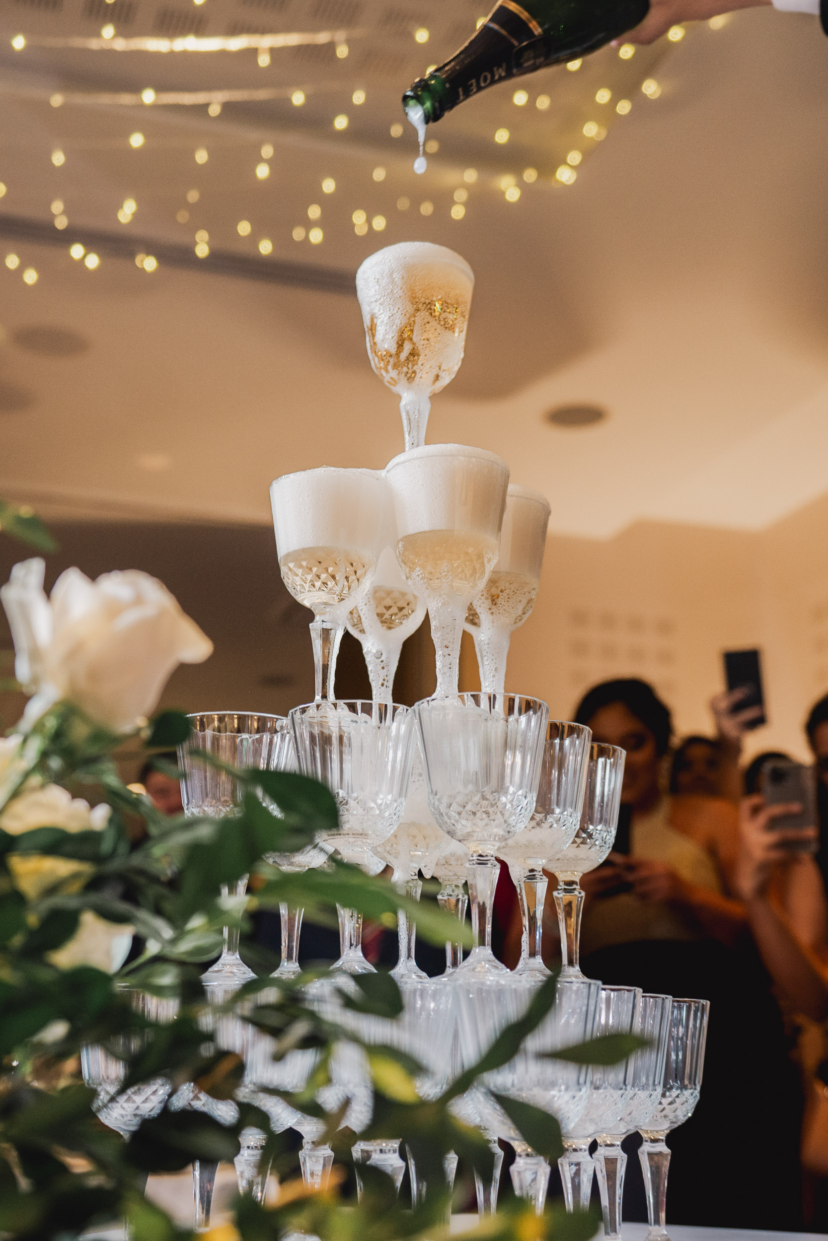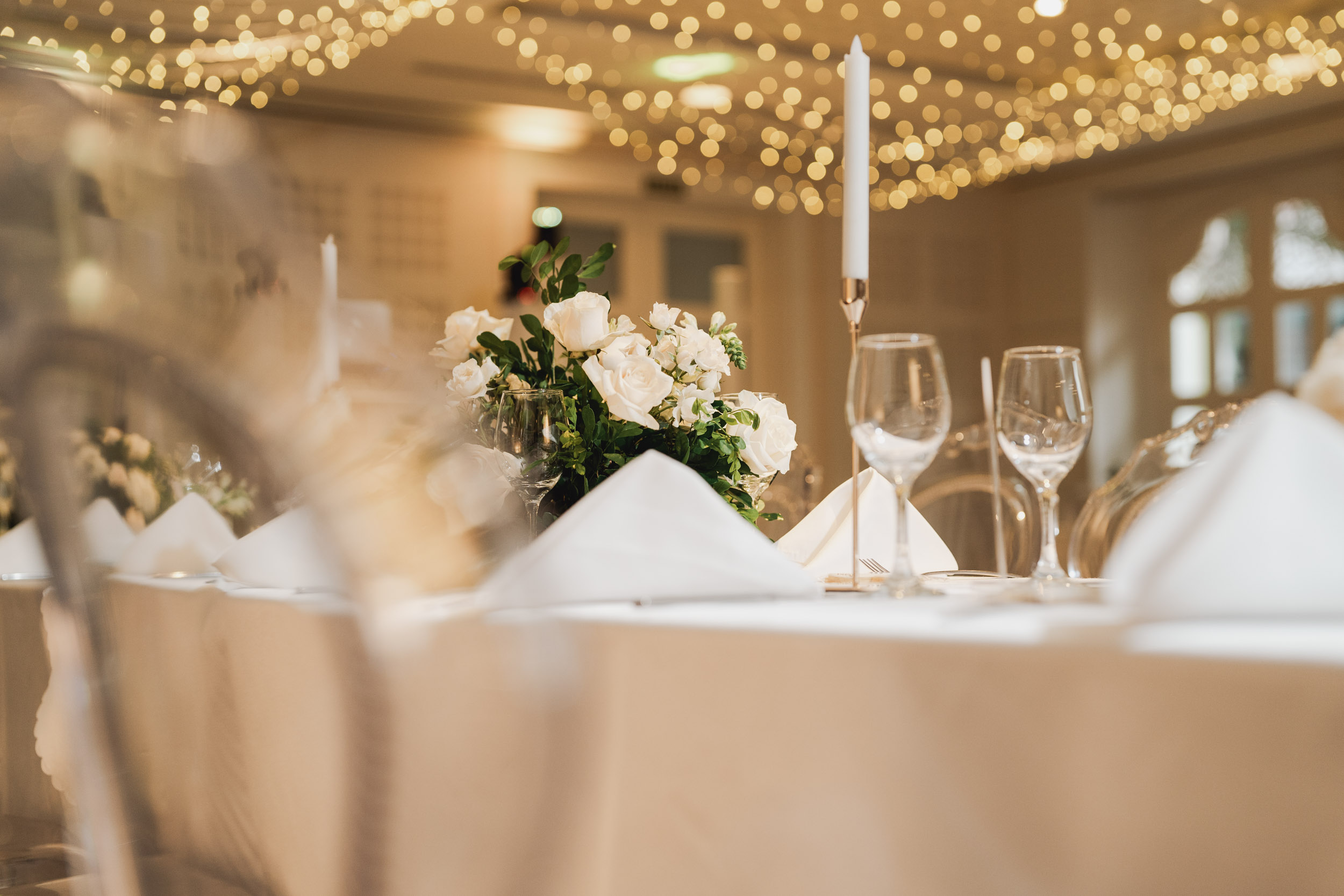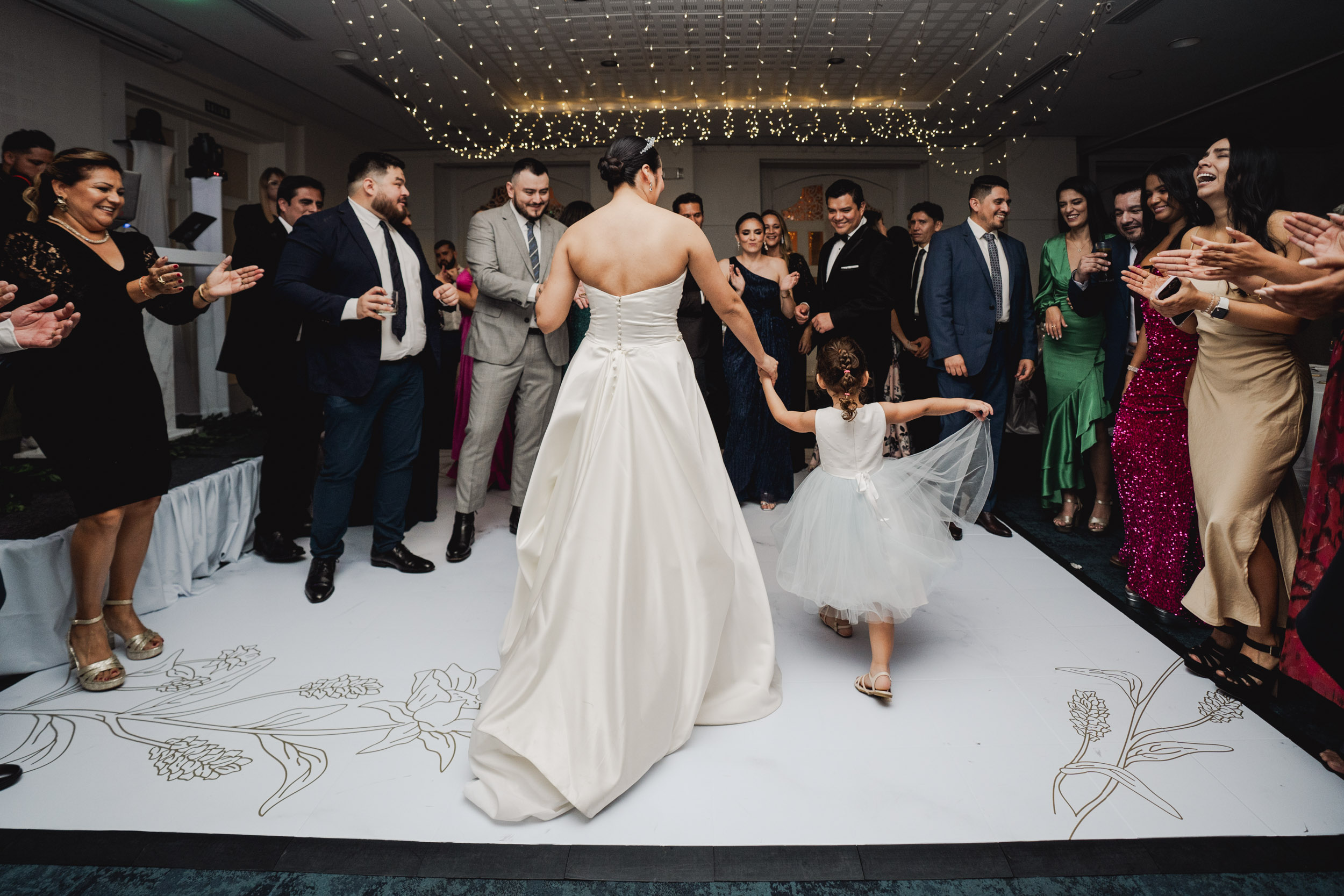 Los novios tenían un gusto impecable por la elegancia, y esto se reflejó en cada rincón. Todos los elementos se complementaban, desde las sillas transparentes a las copas que atrapaban la luz, las lucitas en el techo para crear una atmósfera cálida, y para culminar, un toque de sofisticación con mesas imperiales y redondas.