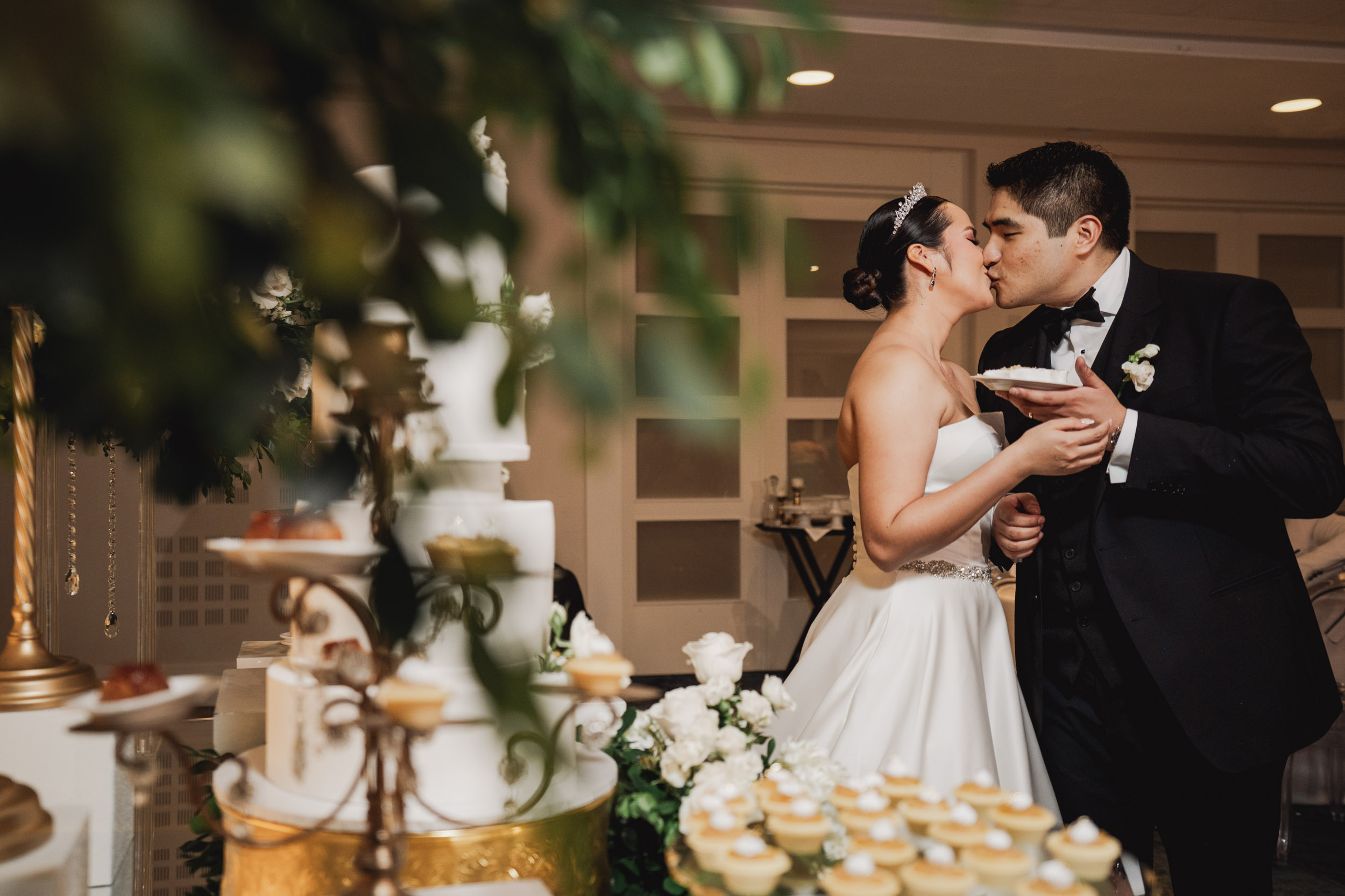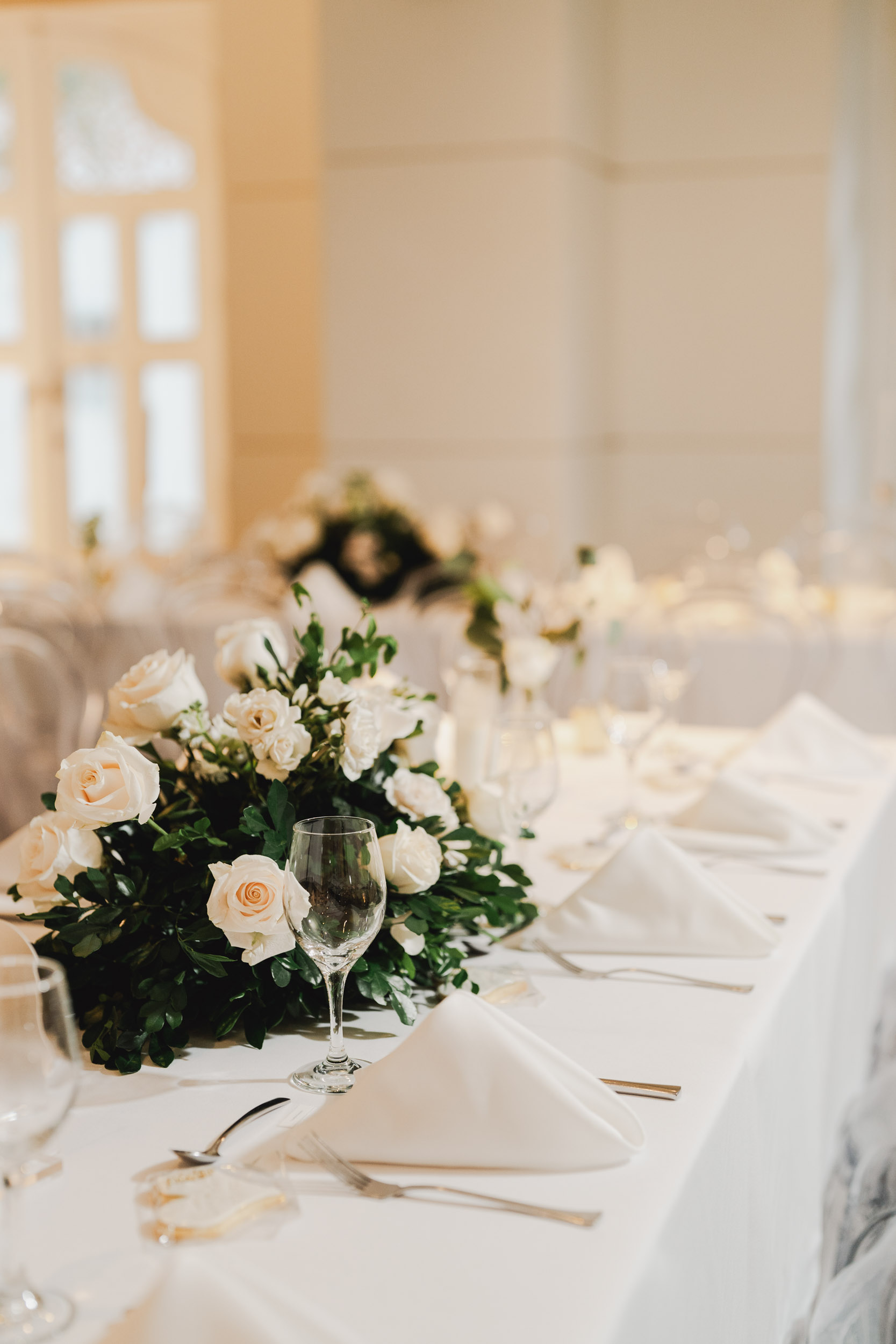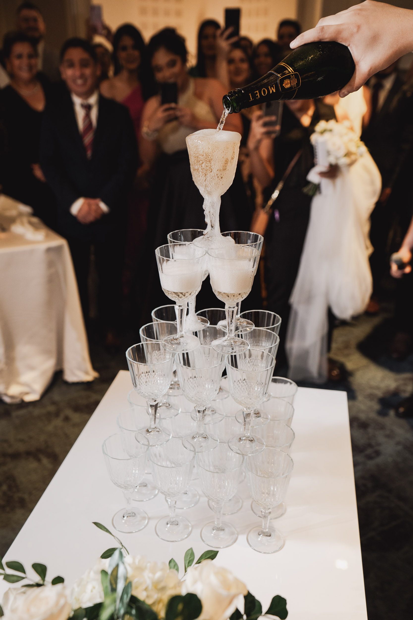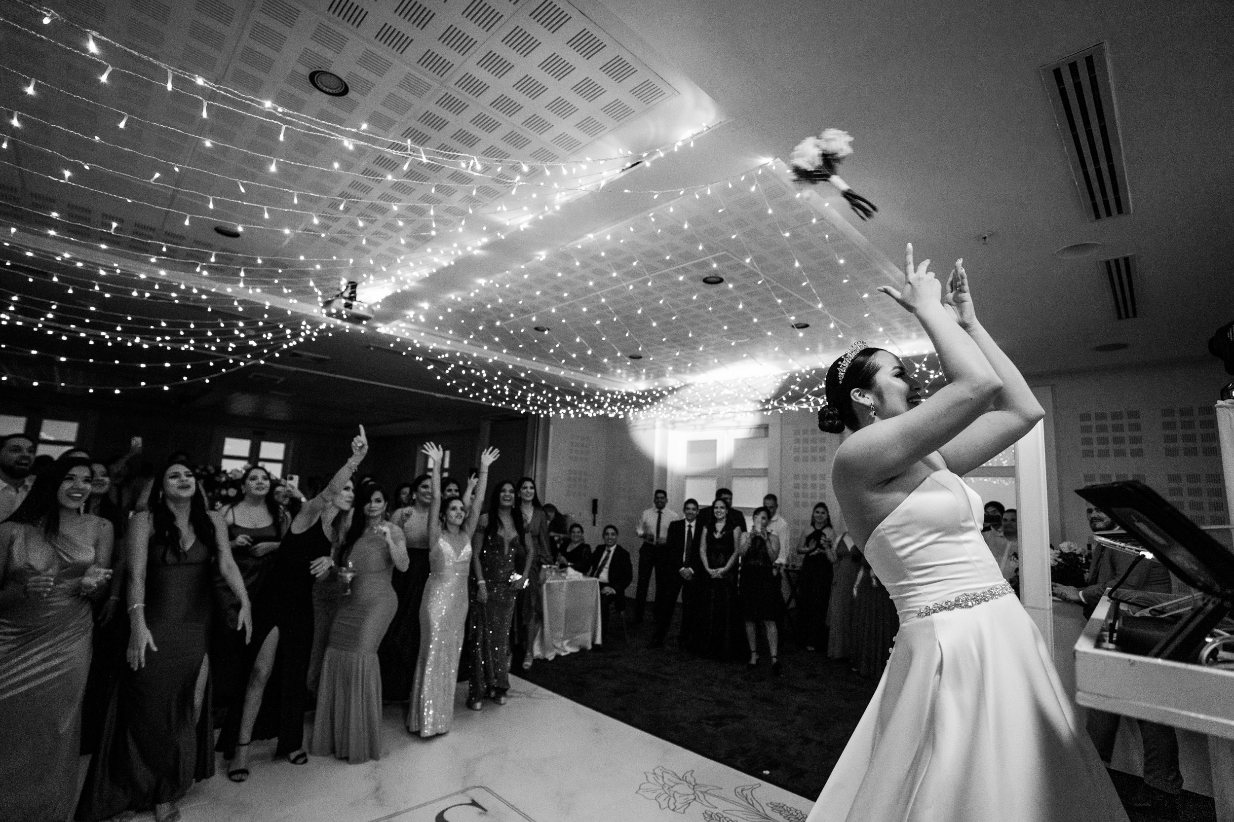 Los novios tenían un gusto impecable por la elegancia, y esto se reflejó en cada rincón. Todos los elementos se complementaban, desde las sillas transparentes a las copas que atrapaban la luz, las lucitas en el techo para crear una atmósfera cálida, y para culminar, un toque de sofisticación con mesas imperiales y redondas.